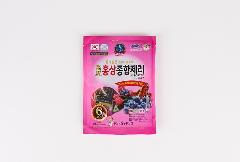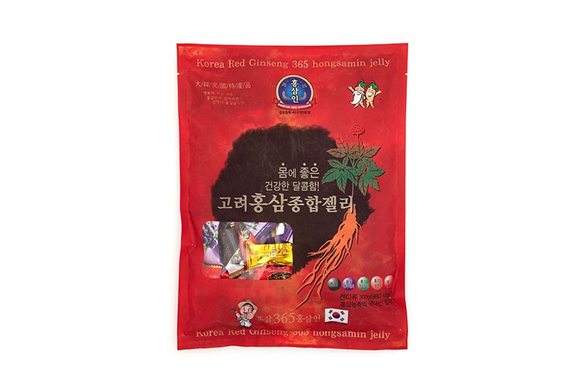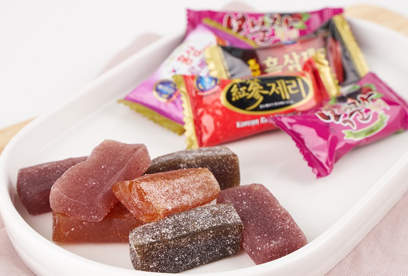 紅参软糖、黒参软糖、 覆盆子软糖, 紅参蓝莓软糖(覆盆子软糖: 糖稀、 淀粉 、精白糖、覆盆子粉、 人造黄油, 乳化剤, 覆盆子香)