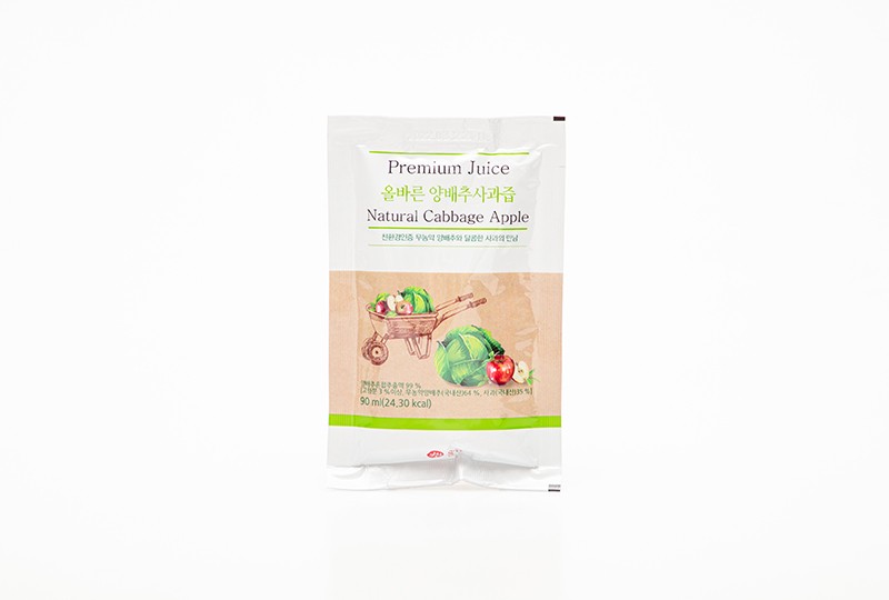 | Raw Materials and Contents | Pesticide-free cabbage extract 97% (Korean, over 3% solid, purified water), apple concentrate 3%((Korean, over 60% solid) |