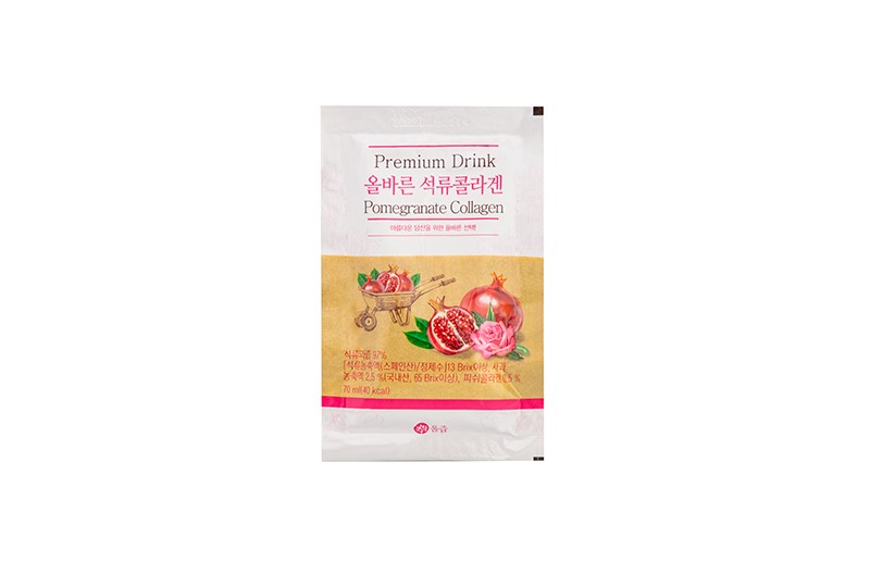 Raw Materials and Contents pomegranate juice 97% (13 Brix or higher, purified water, pomegranate concentrate/Spanish), apple concentrate (65 Brix or higher, Korean), fish collagen 0.5%