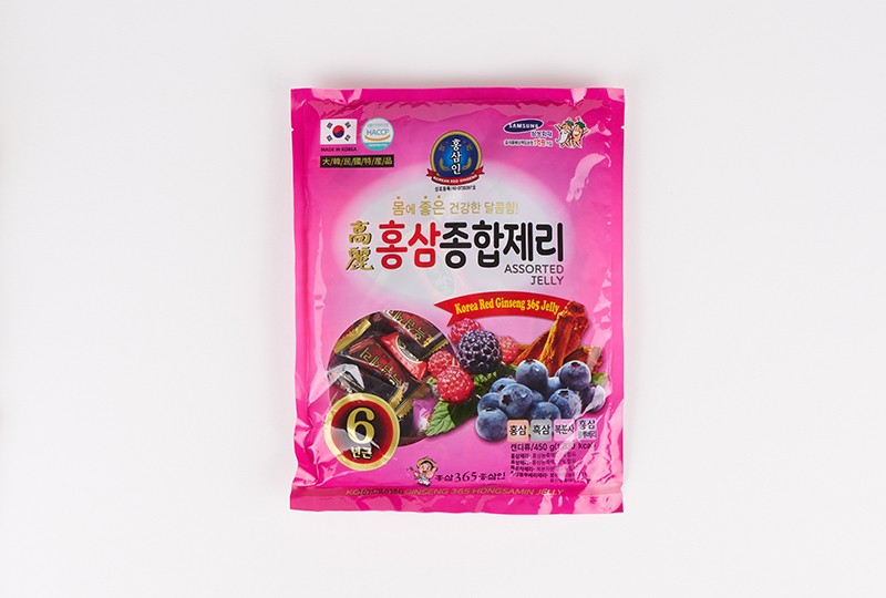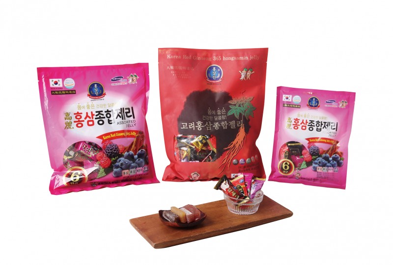 紅参ゼリー、黒参ゼリー、 覆盆子ゼリー, 紅参ブルーベリーゼリー (覆盆子ゼリー: 水あめ、 澱粉 、 精白糖、 覆盆子粉末、 マーガリンの, 乳化剤, 覆盆子の香)