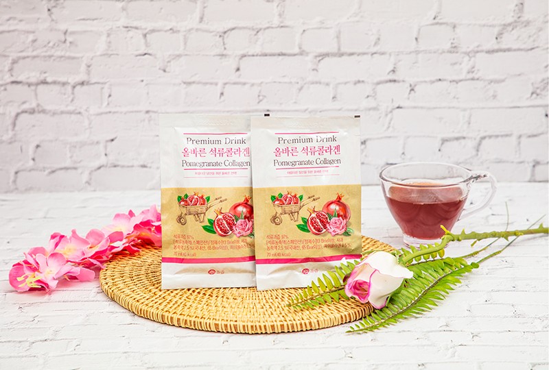 ザクロ果汁 97% [13ブリックス以上, 精製水 , ザクロ濃縮液 / スペイ ン産), リンゴ濃縮液 2.5%( 65ブリックス以上 , 韓国産), フィッシ ュコラーゲン 0.5%
