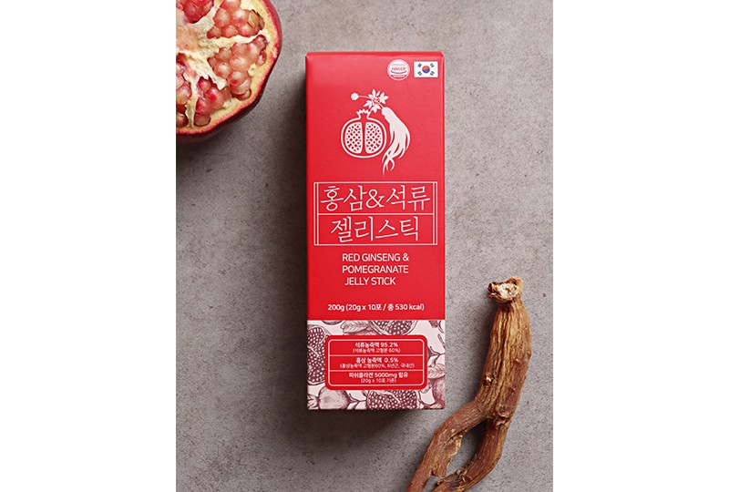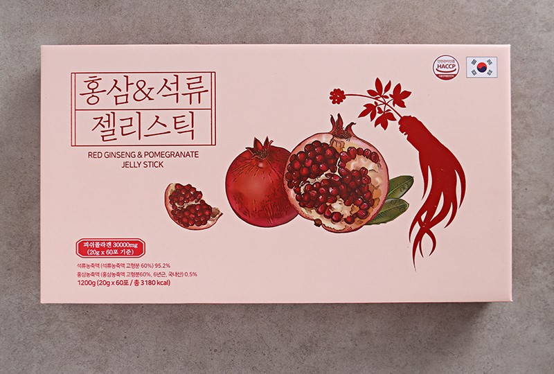 | Thànhphầnnguyênliệu | Cô đặc từ quả lựu (hàm lượng cô đặc từ lựu 60% trở lên, nước Tây Ban Nha) 95,2%, bột collagen cá 2,5%, Cao hồng sâm (6 năm tuổi, xuất xứ Hàn Quốc)0.5%, Locust Đậu Kẹo Cao Su, kẹo cao su xanthan, thạch bột, kẹo cao su me, hỗn hợp carrageenan, clorua kali |